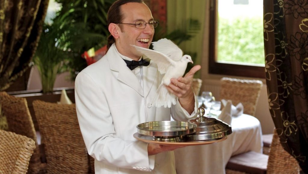 Un faux serveur intègre l’équipe de service en place, pour ensuite créer des situations cocasses, car il va à l’encontre de toutes les règles de restauration. Cette prestation de faux serveur est unique et originale lors de repas. Ce serveur particulier intègre l’équipe de service du traiteur ou restaurateur et va à l’encontre de toutes les règles de restauration. Il provoque des situations cocasses déclenchant des rires et fous rires de la part des convives, il devient le point de mire de toute l’assemblée. Cette comédie d’improvisation est décalée pour le plus grand plaisir des invités, tout est réalisé dans le respect des personnes et des plats servis. Une prérogative : un minimum de personnes doivent-être au courant de cette prestation, pour préserver l’effet de surprise. En effet le but étant de maintenir l’assemblée dans le doute et l’incertitude « vrai ou faux serveur » et sur la « santé » de ce serveur peu ordinaire.